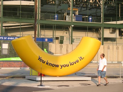 We here at this blog have discussed some of the strange moves the Cubs marketing department has made this year. When things like colossal cheese covered macaroni show up in front of a baseball shrine - it tends to lead to discussions.As foolish as that noodle may be, the fact they had to install these here signs around it is just ridiculous. But, I guess if you put a shiny object in front of 40,000 drunk spectators, a few of them are going to decide - I'm gonna climb that there noodle.